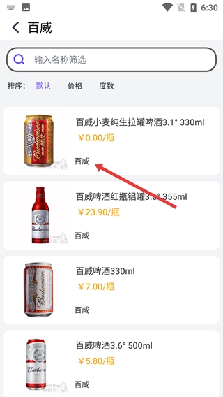 3、在啤酒列表界面,点击【百威】选项,即可进入百威啤酒的具体产品页面。