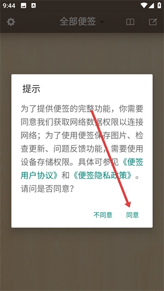 1、打开便签应用后,若弹出权限申请提示,点击【同意】按钮,以此获取网络与存储权限,从而使用软件的全部功能。