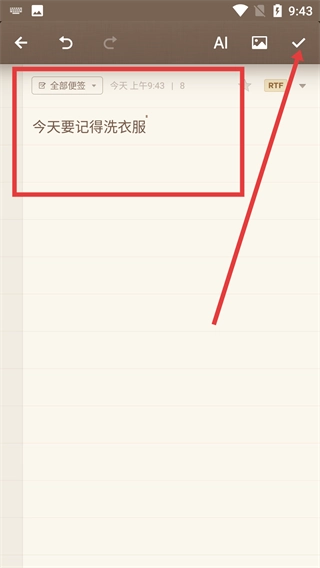 3、在编辑页面输入内容,比如【今天别忘了洗衣服】,再点击右上角的对勾按钮完成保存。