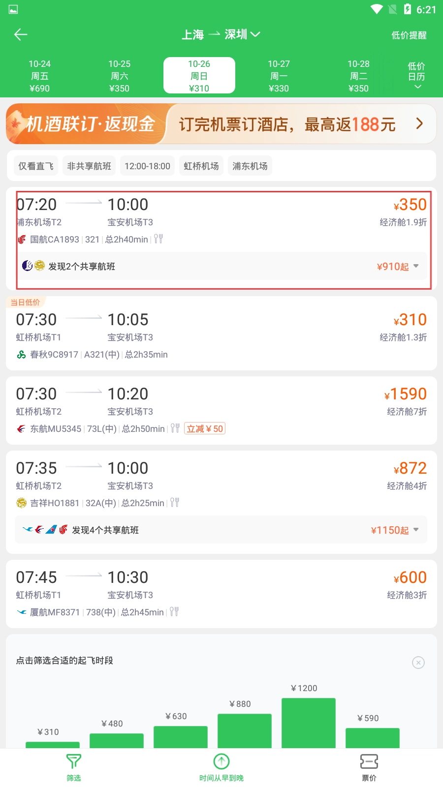 3、在航班列表页面,挑选合适的航班,例如国航CA1893航班。