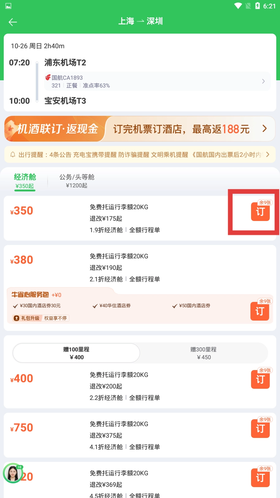 4、进入航班详情页面后,点击【订-功能按钮】,即可开展机票预订流程。