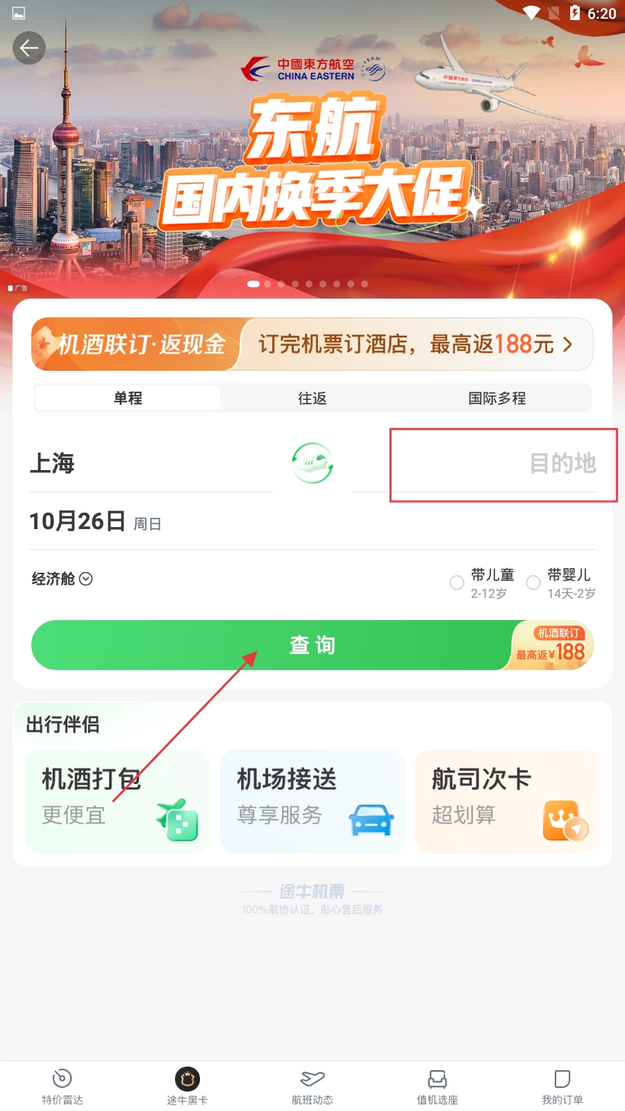 2、在机票预订页面,选定出发地、目的地、出行日期等信息后,点击【查询】功能按钮。