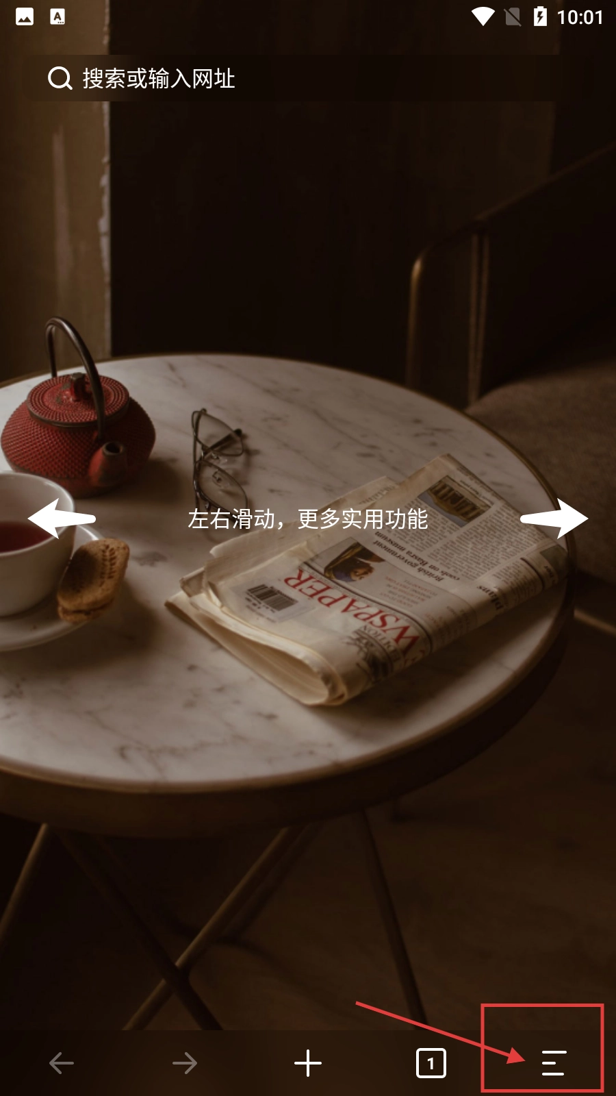进入浏览器主界面后,可通过顶部的搜索栏进行搜索或输入网址;点击右下角的三横线图标,就能展开功能菜单。