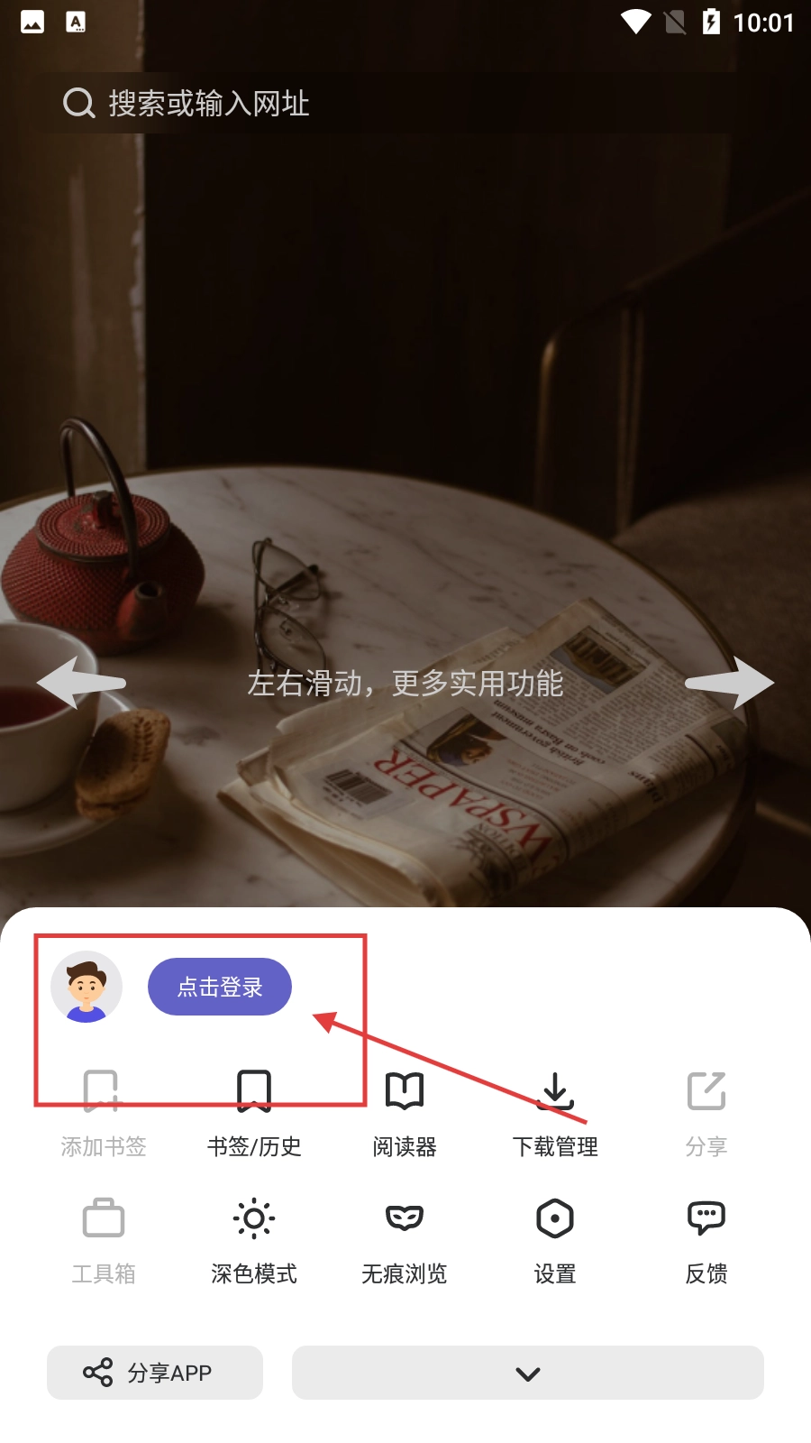 3、在功能菜单里,点击【点击登录】按钮就能进入登录流程,这样就能使用书签、历史记录等个性化功能了。