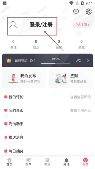 在个人中心页面,点击【登录/注册】区域即可进入登录界面,同时还能查看会员等级、我的发布等功能模块。