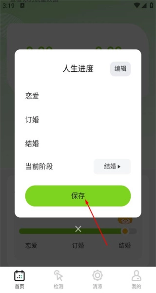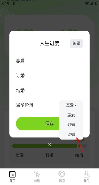 2、进入人生进度编辑界面后,将当前阶段选定为结婚;该界面会呈现恋爱、订婚、结婚这几个选项,用户可根据自身需求挑选对应的阶段。