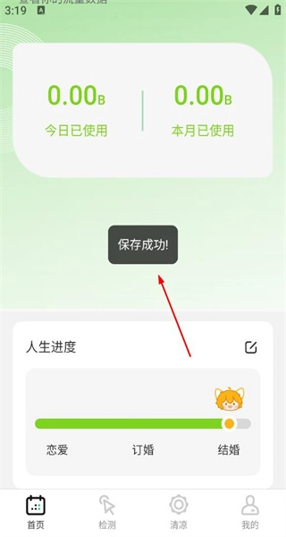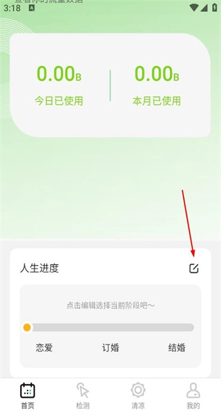 1、打开软件首页,能看到今日与本月的流量使用情况,点击人生进度的编辑按钮,界面上还设有检测、清凉等功能的入口。