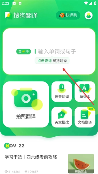 1、在搜狗翻译首页点击输入框,进入翻译输入页面。