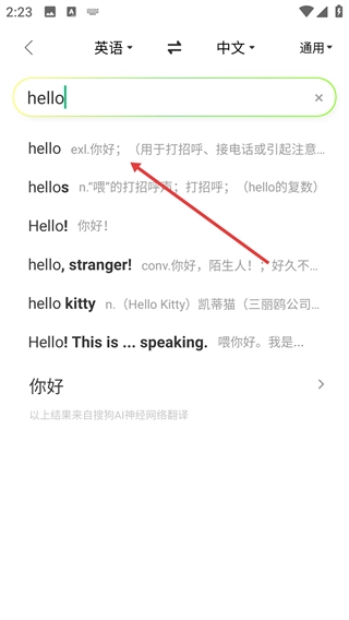 3、输入完成后,选择对应的翻译结果选项,进入单词详情页面。
