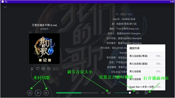 6、页面底部的小工具可用于切歌、调节音量、打开播放列表等操作。