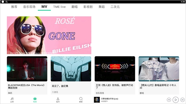 1、在首页或分类栏浏览推荐内容、歌单、MV,点击歌曲即可播放,横屏时能查看更详细的歌词与专辑信息。