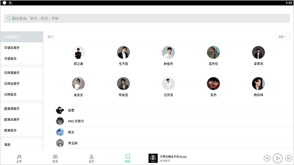 3、也可以在搜索页面,借助顶部的搜索框直接搜索歌曲,或者通过歌手分类来查找并播放歌曲。