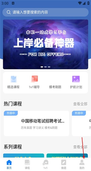 打开软件进入首页后,能看到精选课程、1v1辅导等功能板块,接着点击“我的”,即可进入个人中心页面。