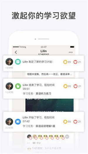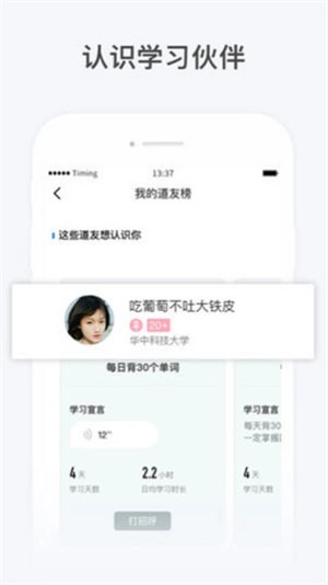 依据学习时长和兴趣来匹配伙伴,和懂你的人实时互动,彼此督促共同进步。