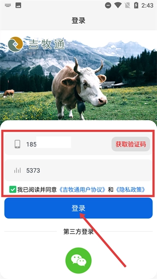 2、进入吉牧通的【登录】页面,填写号码并点击【获取验证码】,输入验证码后勾选协议,点击【登录】按钮完成登录操作。