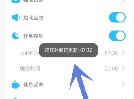 6.回到设置页面,会看到早起时间已更新的提示,接着用相同的方法设置睡觉时间,这样就能完成作息控制的时间设置了。