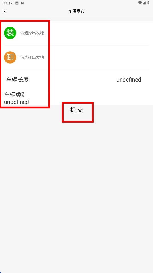 4、进入车源发布页面后,依次填写出发地(装/卸)、车辆长度、车辆类别等相关信息,完成后点击【提交】按钮,即可发布车源信息。