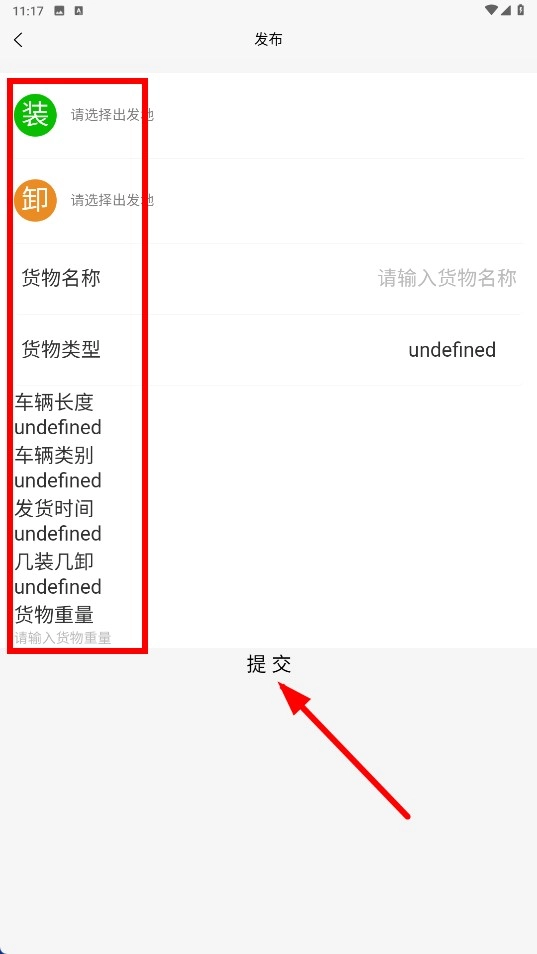 2、进入发布页面后,填写出发地(装货/卸货)、货物名称、货物类型等相关信息,信息填写完毕后,点击【提交】按钮即可发布货运需求。