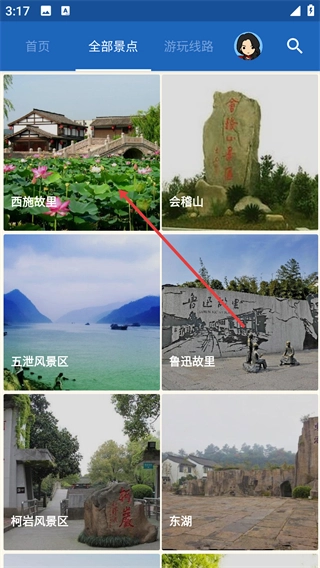 1、点击顶部的【全部景点】选项,就能进入绍兴地区的景点列表页面,在这里可以浏览西施故里、会稽山等景区。