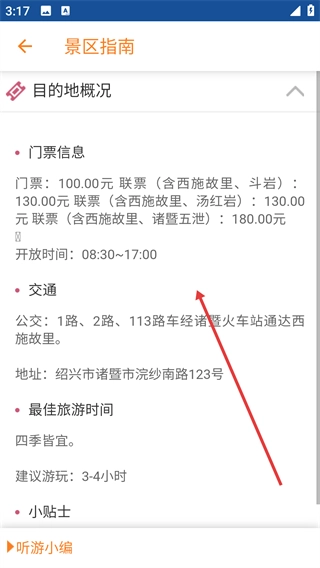 4、在景区指南页面,能够查询到西施故里的门票价格、开放时间、交通路线等相关信息,从而帮助游客规划游览行程。