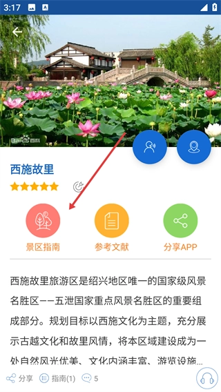 3、在西施故里详情页点击【景区指南】按钮,进入景区信息页面后,就能查看门票、交通等实用内容。
