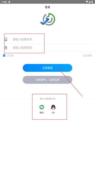 在登录页面,用户可以选择输入账号和密码后点击“立即登录”按钮,也可以通过微信、QQ等第三方平台进行登录。
