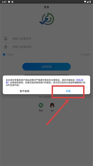 1、当登录界面弹出提示框时,请点击【同意】按钮,确认隐私政策后即可继续后续操作。