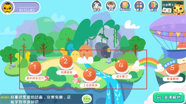 进入应用主界面后,你可以选择不同关卡开展学习互动,界面还设有账号、客服等功能入口,并且支持通过多课解锁来获取拓展内容。