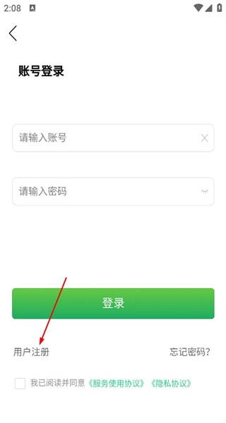 3、进入账号登录页面后,点击用户注册选项,即可切换到账号注册的信息填写界面。