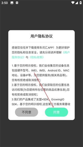 打开车讯汇应用后,会弹出【用户隐私协议】的提示窗口,建议您仔细阅读《用户服务协议》和《隐私政策》的内容,确认无误后点击【同意】按钮,即可继续使用该应用。