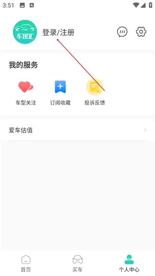 2、进入“个人中心”页面后,点击顶部的【登录/注册】区域,即可进入登录相关界面,在此过程中还能看到“车型关注”“爱车估值”等功能的入口。