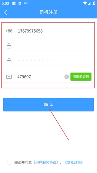 4、在司机注册页面填写账号、密码和验证码,勾选相关协议后点击【确认】按钮,即可完成司机账号的注册流程。