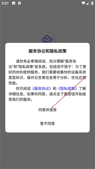 1、请先仔细阅读【服务协议】与【隐私政策】,在充分了解信息收集相关规则后,若同意相关条款,可点击【同意并接受】以继续使用服务;若暂不认可,也可选择【暂不同意】。