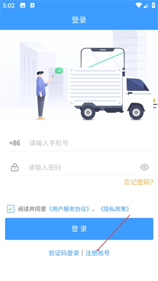 2、在登录页面输入账号与密码,勾选相关协议后点击【登录】按钮即可完成登录;此外,还可选择【验证码登录】或【注册账号】选项来执行相应操作。