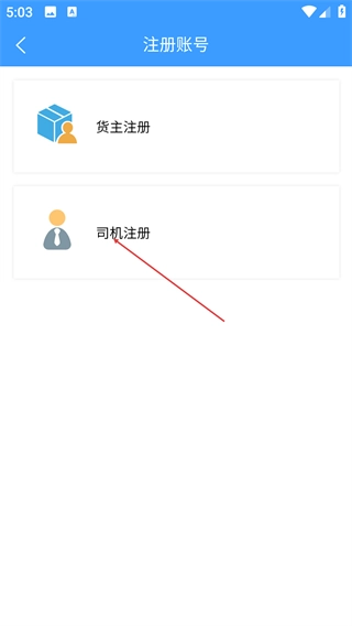 3、进入注册账号页面后,根据自身身份选择【货主注册】或【司机注册】选项,点击对应选项即可进入相应的注册流程。