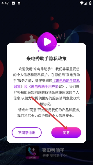 1、在【来电秀助手隐私政策】弹窗里,点击紫色的【同意】按钮,就能进入来电秀助手后续的功能页面。