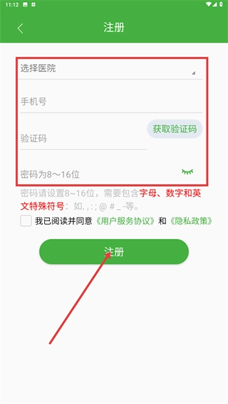 在注册页面,先点击【选择医院】,接着填写【号】,然后点击【获取验证码】,勾选相关协议后,再点击【注册】按钮,即可完成账号创建。