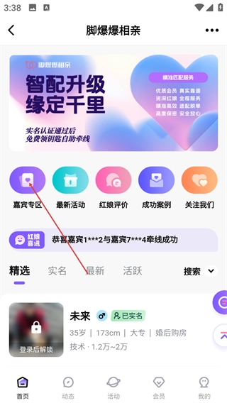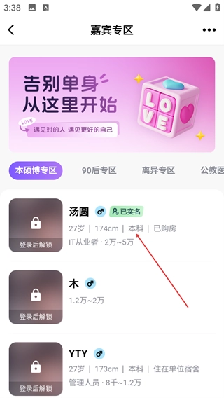 在相亲页面里,点击【嘉宾专区】选项,就能查看不同分类(像本硕博、90后之类)的相亲嘉宾列表。