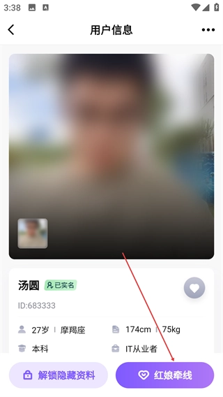 4、在用户信息页面,您可以点击【解锁隐藏资料】来查看更多信息,也可以点击【红娘牵线】提交相亲对接申请。