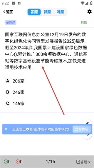 4、进入试题答题界面后,在【答题】模式下能够查看题目内容,通过选择选项来完成该单选题的作答。