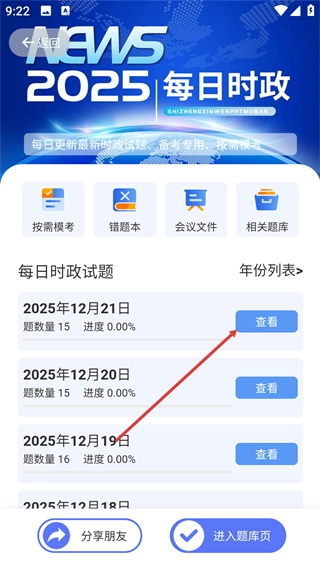 3、在每日时政页面,找到目标日期(例如2025年12月21日),点击其对应的【查看】按钮,即可进入该日期的试题详情页面。