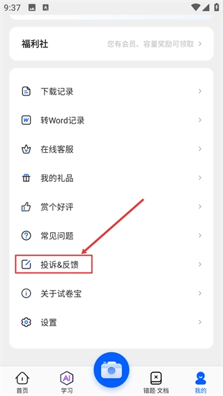 2、进入个人中心页面后,找到并点击【投诉&反馈】选项,即可进入反馈内容填写界面。