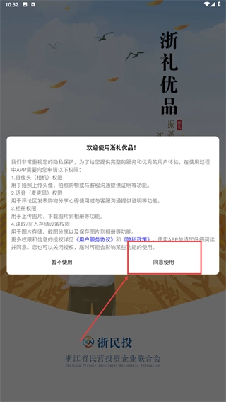 1、打开浙礼优品应用,仔细阅读权限申请说明后,点击【同意使用】按钮,授予应用所需的权限,以便正常使用各项功能。