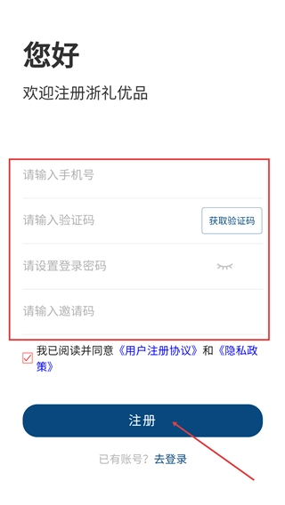 3、进入注册页面后,请依次填写【号】、输入【验证码】和【登录密码】,【邀请码】为选填项,填写完成后勾选相关协议,最后点击【注册】按钮即可完成账号创建。