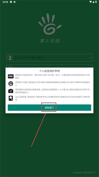 2、仔细阅读【个人信息保护声明】后,点击【我知道了】按钮,确认对信息授权说明的知晓,即可进入应用的登录界面。