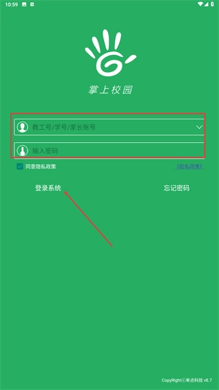 3、在掌上校园的登录页面,先选择对应的账号类型(可选择教工号、学号或家长账号),接着输入该类型下的账号和密码,然后勾选“同意隐私政策”选项,最后点击【登录系统】按钮,即可完成登录操作。