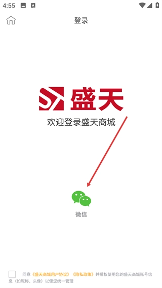 2、进入【登录】页面后,先确认页面显示内容为【盛天】-【欢迎登录盛天商城】,再选择【微信】渠道进行登录操作。