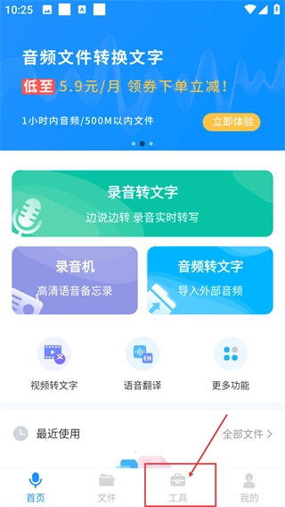 1、在音频转文字软件的首页,点击底部的【工具】选项就能进入工具页面,首页里还设有【录音转文字】、【音频转文字】这类核心功能。