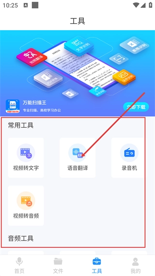 2、进入【工具】页面后,在常用工具区域找到【语音翻译】功能,点击该功能就能进入对应的语音翻译操作界面。