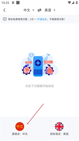3、进入【语音翻译】页面后,先确认源语言是【中文】、目标语言是【英语】,接着点击页面底部对应的语言按钮,就能启动语音输入功能了。